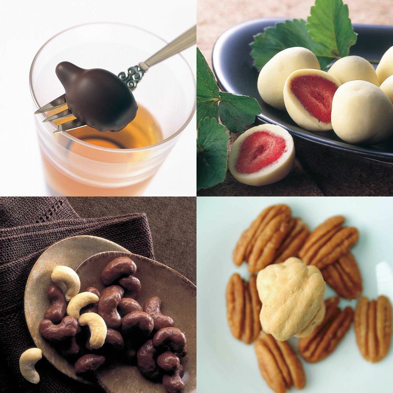 ウイスキーボンボン 化粧箱とイチゴのチョコレート 角箱とカシューナッツチョコレート 角箱とピーカンナッツチョコレート 化粧箱の【角箱2箱・化粧箱2箱セット】