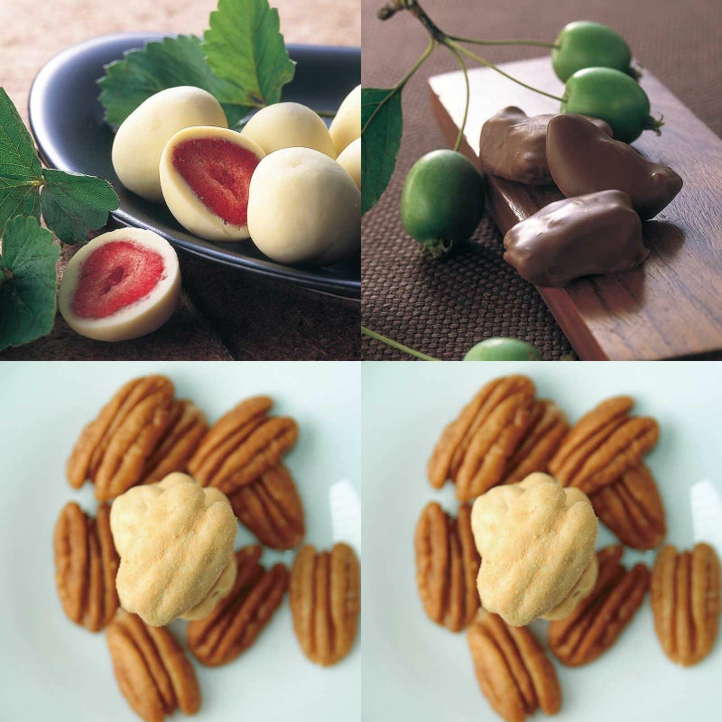 3. イチゴのチョコレート 角箱とリンゴのチョコレート 角箱とピーカンナッツチョコレート 化粧箱とピーカンナッツチョコレート 化粧箱の【角箱2箱・化粧箱2箱セット】