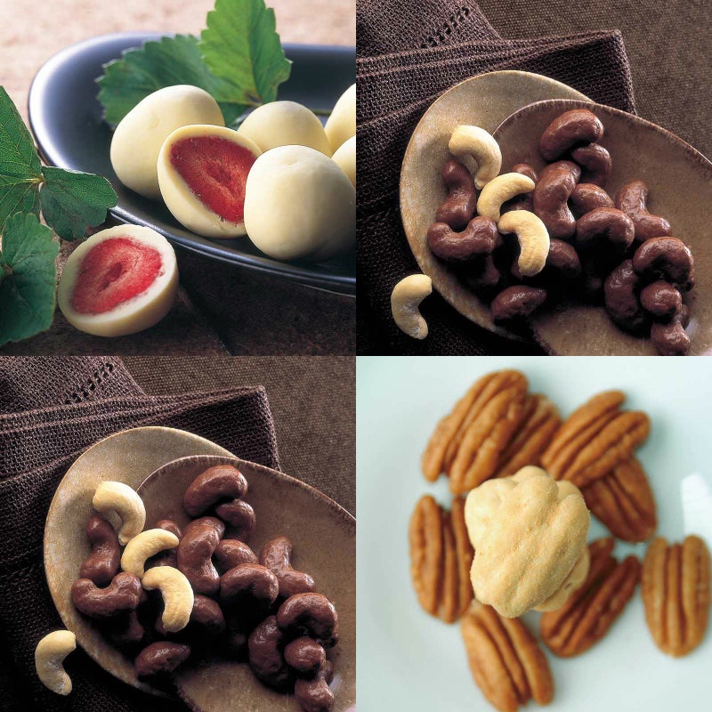 イチゴのチョコレート 角箱とカシューナッツチョコレート 角箱とカシューナッツチョコレート 化粧箱とピーカンナッツチョコレート 化粧箱の【角箱2箱・化粧箱2箱セット】