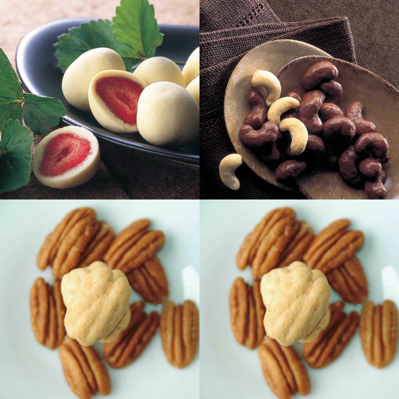 3. イチゴのチョコレート 化粧箱とカシューナッツチョコレート 角箱とピーカンナッツチョコレート 角箱とピーカンナッツチョコレート 化粧箱の【角箱2箱・化粧箱2箱セット】