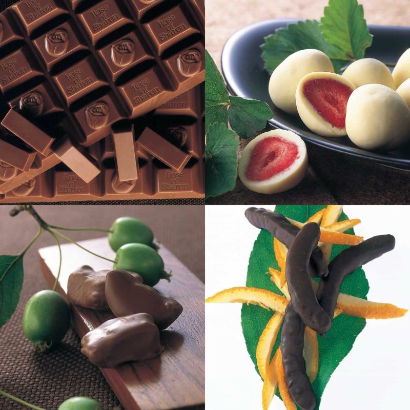 プチ・ローズオブシャロン 化粧箱とイチゴのチョコレート 化粧箱とリンゴのチョコレート 角箱とオレンジピールチョコレート 角箱の【角箱2箱・化粧箱2箱セット】